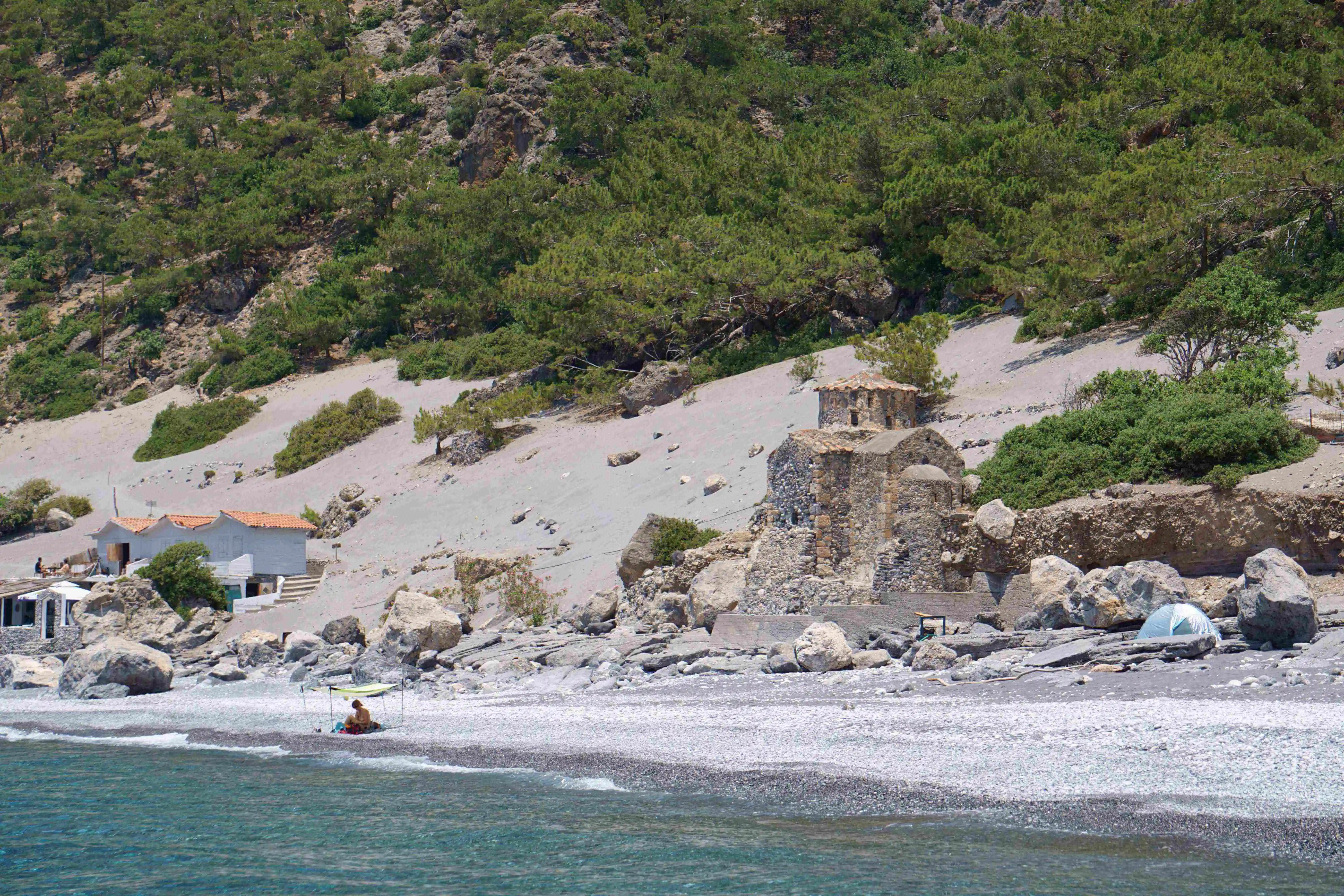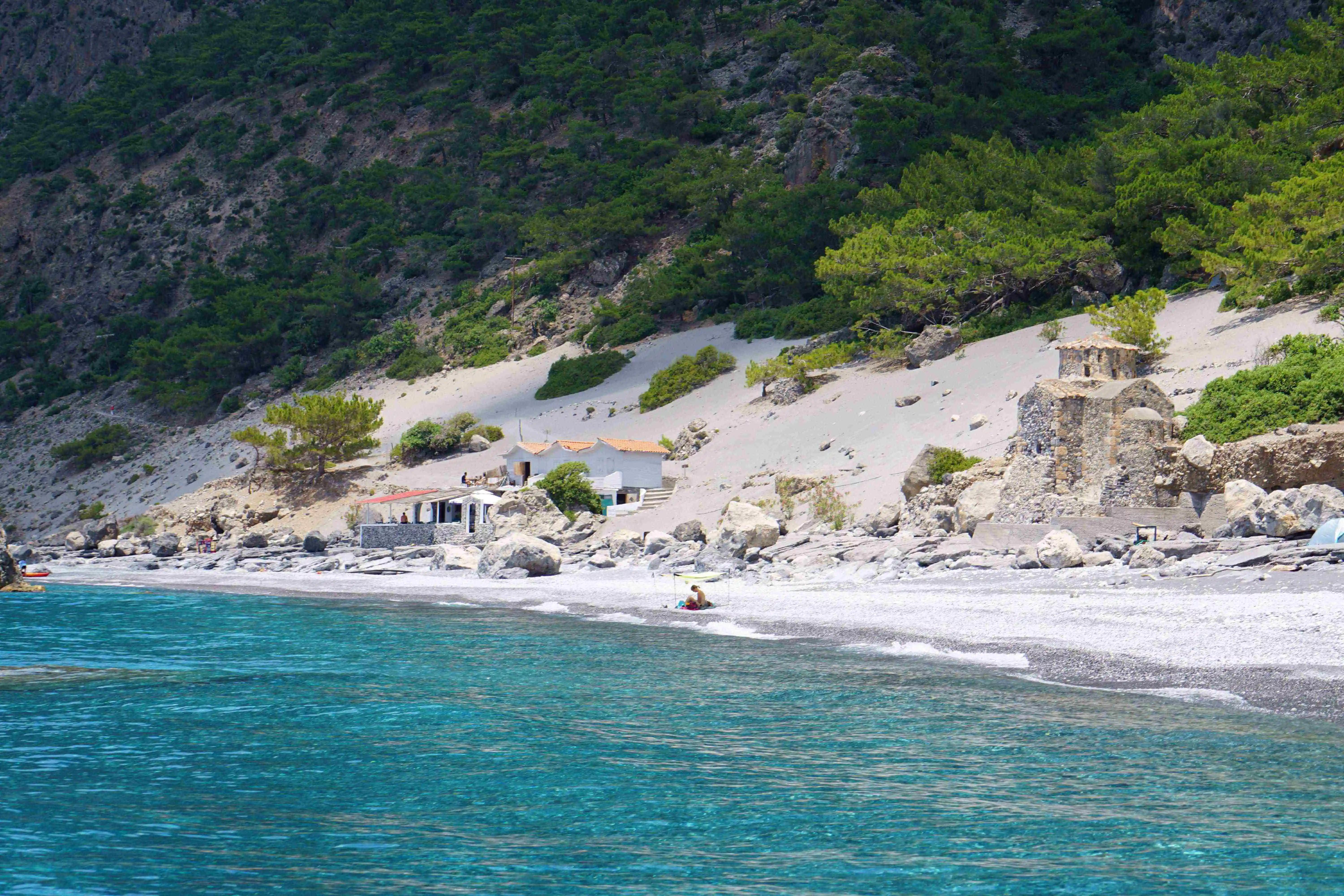 You can camp for free on the beach after hiking in via the ocean trail. This is a common occurance at most beaches in this area but beware it can be VERY hot here in summer - so take all essentials to be self sufficient. Otherwise your only options for hotels or Airbnbs are in nearby Loutro or Sfakia.
