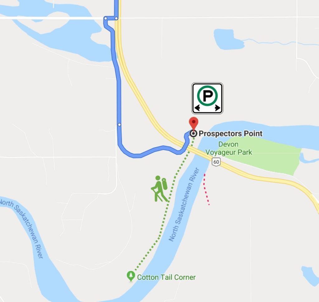 By Car: From Edmonton, take Highway 16A west to Highway 60 south. Turn right on Gramina Rd (Township 511), then an immediate left on Prospector’s Point Road. Follow it down into the valley to the Prospector’s Point parking lot. From there, walk upstream sbout 40 minutes along the lower forest path following pink markers until you reach the signed naturist area.