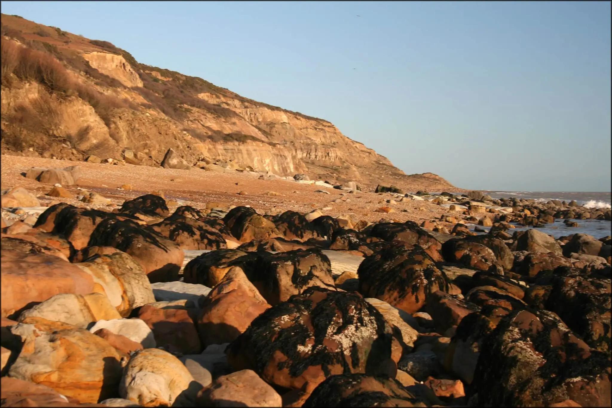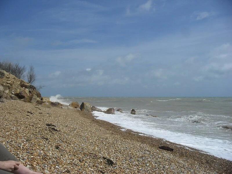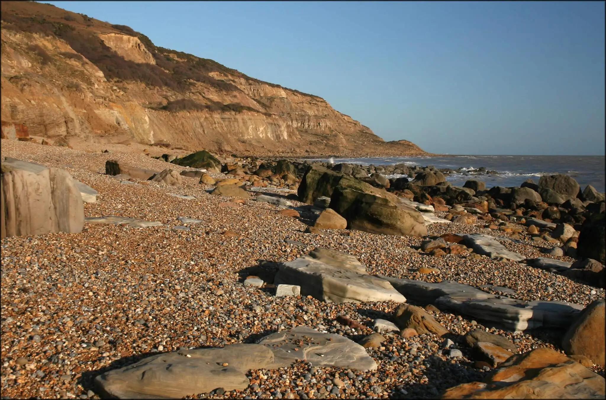 Turning right from the main beach (west) toward Hastings, the coast is more rugged and rocky. Walking along the rocky seabed beneath the cliffs is more accessible either by hopping from rock to rock or following the shoreline at low tide. However, remember that this isn’t the most accessible route because winter storms can cause cliff erosion which may limit access.