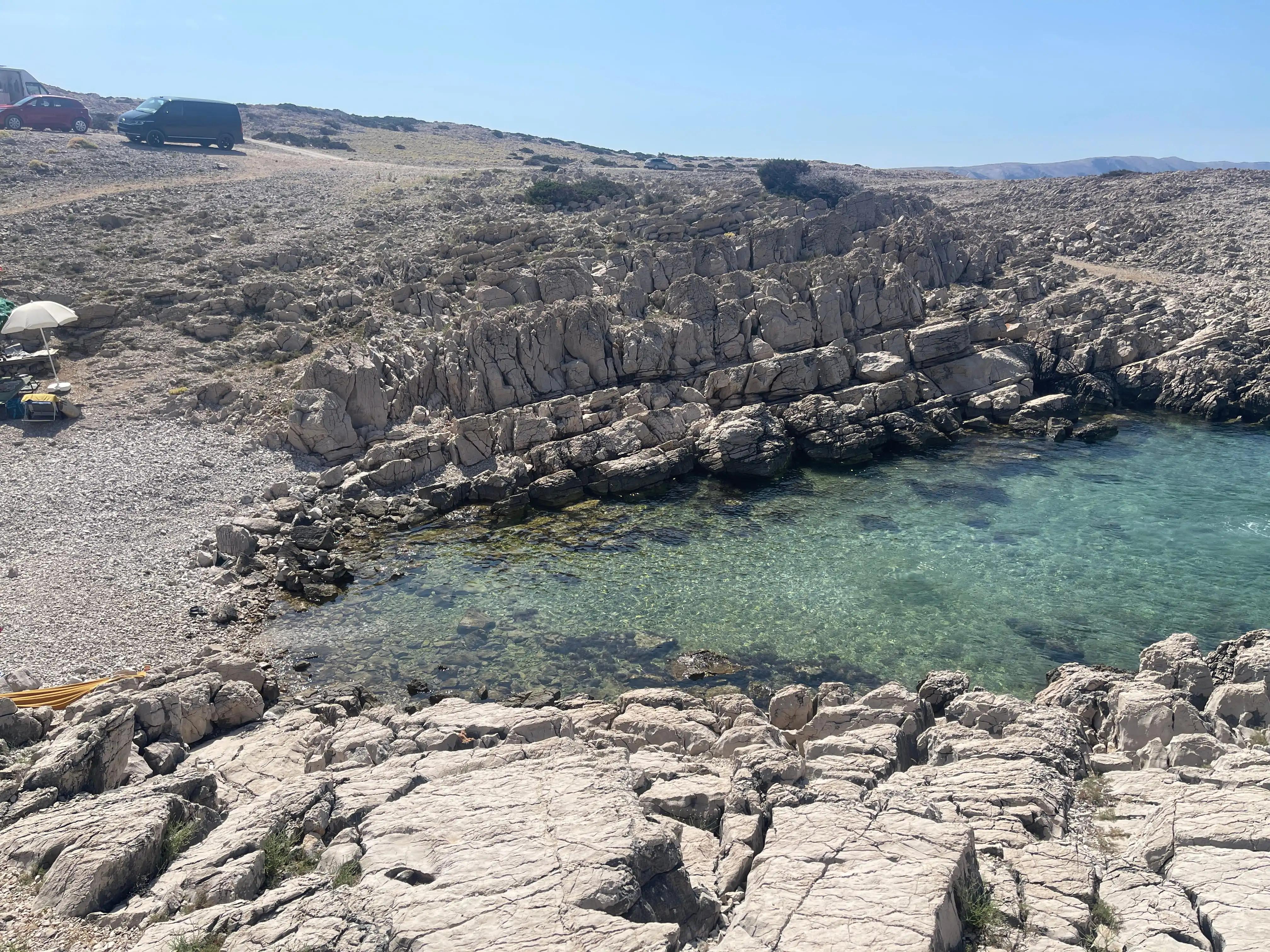 This beach isn’t really suited to long walks from nearby towns due to its location and lack of coastal paths. It would be around a 45 minute walk in the heat from Stara Novalja (no shade at all). Walking access works best once you’ve parked near the top and head down to the beach.