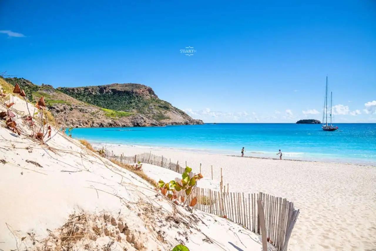 - Scenic beauty: Wide stretch of soft white sand with turquoise water and rolling dunes. One of St. Barth’s most natural and unspoiled beaches.