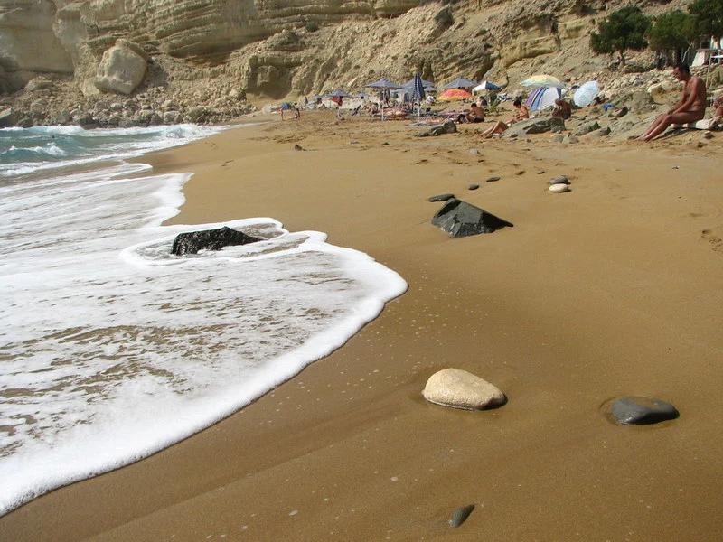 Red Beach is one of most distinctive naturist spots in Crete - not for comfort, but for atmosphere. It feels wild and unpolished, with ochre-colored sand, blue-green water, and goats wandering the cliffs. The vibe is casual and friendly, and it’s easy to find your spot, whether you prefer swimwear or none at all.
