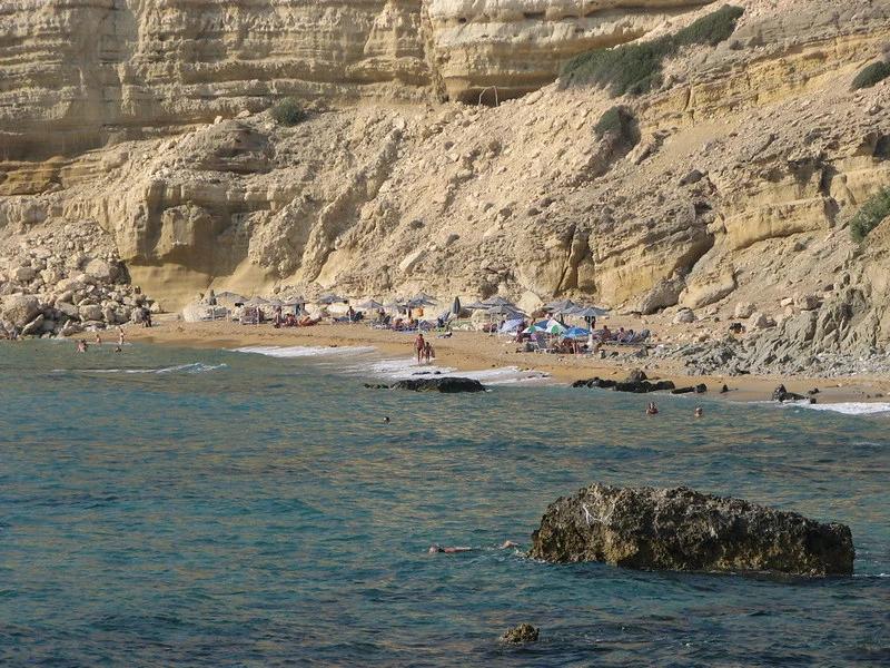 Park in Matala and follow the signed trail south toward Kokkini Ammos. The path climbs steeply over rocky hills, offering spectacular views of the bay before winding down to the red sand below. The hike takes about 15–20 minutes, so bring water and wear sturdy shoes - it can get hot and slippery in the midday sun.