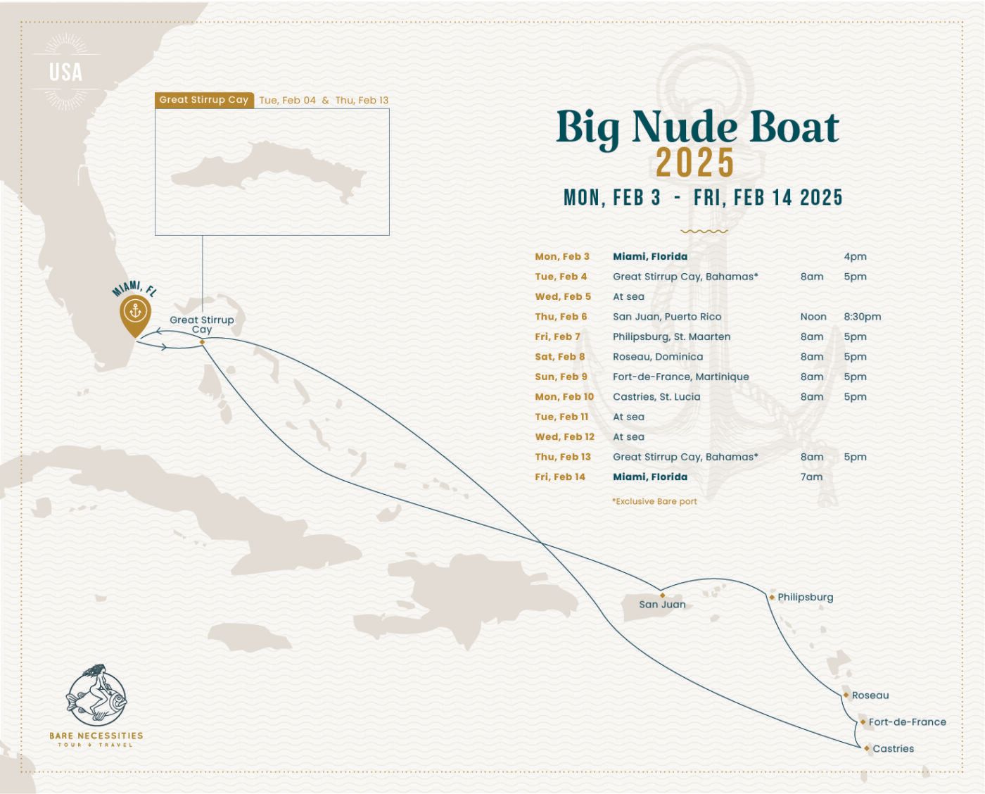 The Big Nude Boat 2024 lasted 7 days, departing from Tampa and visiting Cozumel and Costa Maya in Mexico, as well as Mahogany Bay in Honduras, where the ship had private use of Carnival’s island. The cruise gets even bigger in 2025 – literally. The Norwegian Pearl will welcome over 2,300 nude guests, with staterooms spread across seven decks. The ship offers 16 dining venues, 14 bars and lounges, a casino, and a spa, so guests will have ample opportunities to relax and socialize with people who share their interests. The itinerary is epic, lasting 11 days and visiting nearly half a dozen Caribbean islands. This is the best itinerary we’ve seen The Big Nude Boat put together!
