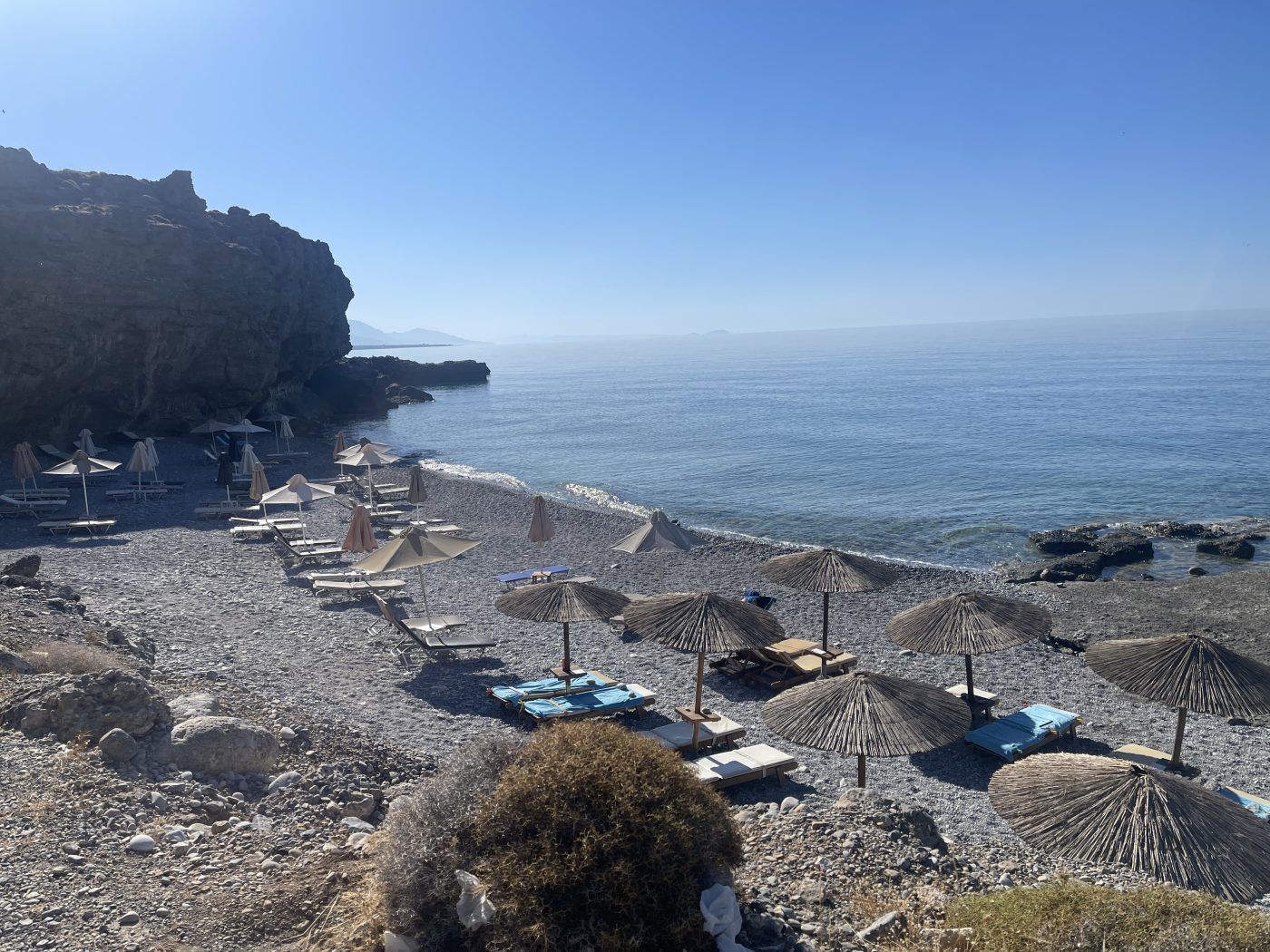 At the beach, there’s a taverna run by the resort where you can rent loungers and umbrellas, and order food and drinks. We highly recommend staying for lunch because the traditional Greek fare is excellent. There’s also a bathroom with showers for rinsing off. The beach itself is rocky, so don’t forget your water shoes. The water is crystal clear and calm, perfect for floating, swimming, or just dipping in to cool off.